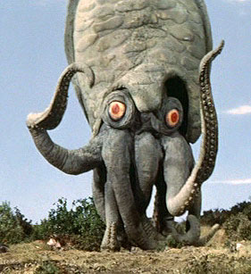 the island. Gezora is referred to as both a squid and an octopus in the picture depending upon which audio and subtitles you are referencing, but he mostly reflects the proportions of a squid in my opinion. He isn’t very convincing in his motions with his suit wrinkling and folding unnaturally. His eyes look very fake as well. Gezora is a pretty obscure monster even within Toho’s fans, but it’s not without warrant.